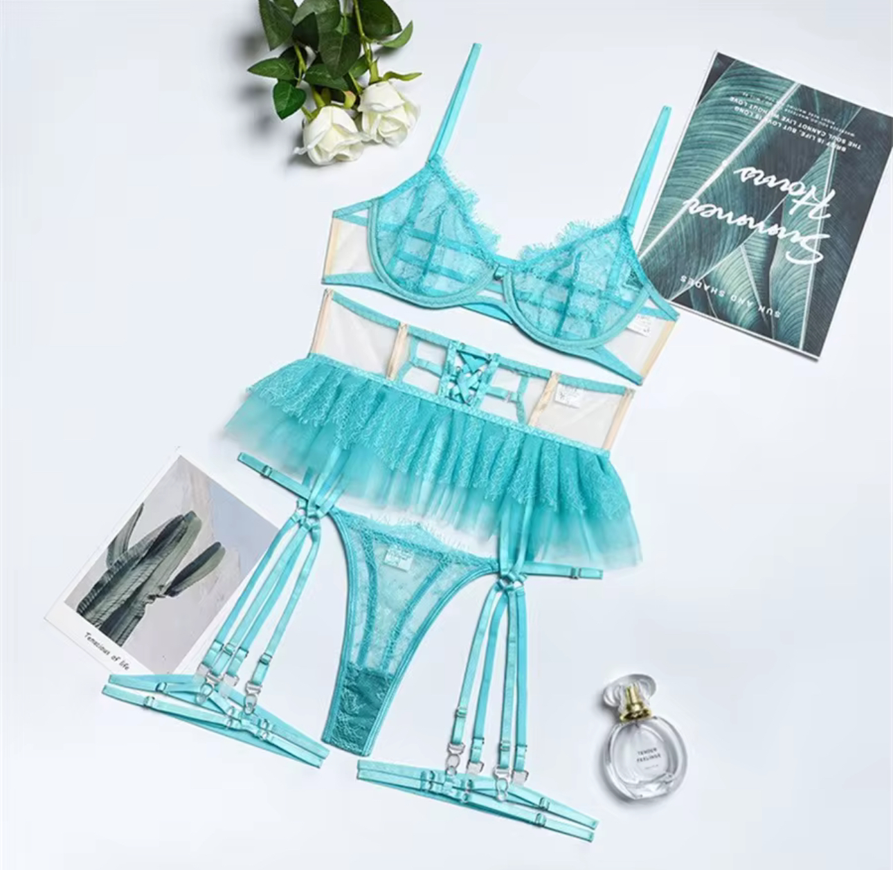 Dreamy turquoise mesh paired with layered tulle around the waist corset. Includes bra, thong, garter belt with tutu-style lace, and strappy leg harnesses.