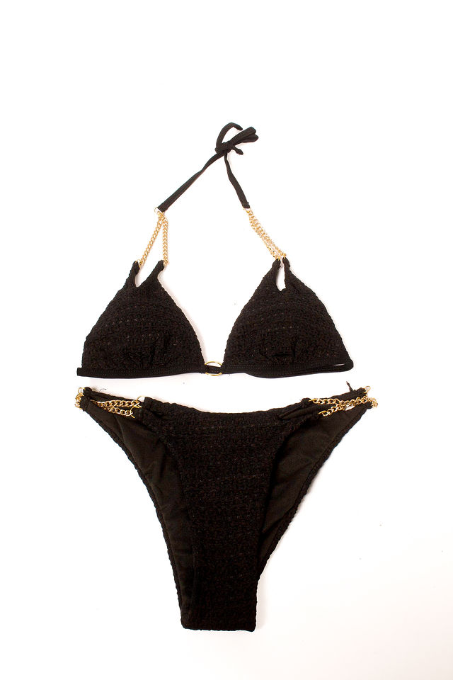 Black textured bikini with gold chain straps.