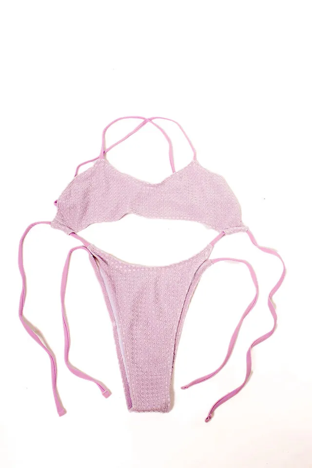 Blush pink bikini with luxe gold chain straps. Features a soft textured finish and triangle cut. Feminine, clean, and subtly powerful.