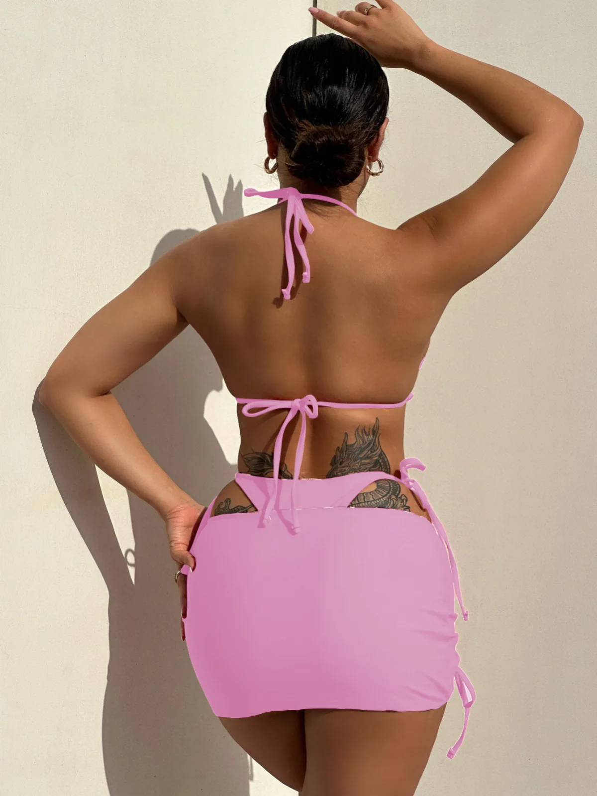 Bubblegum pink 3-piece bikini set with matching wrap skirt.