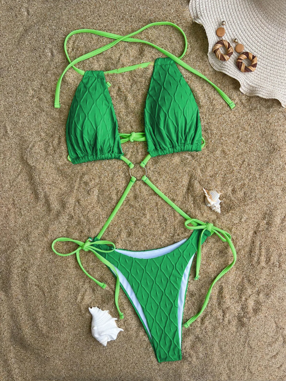 Fresh green textured bikini in a classic triangle style. The ribbed textured fabric adds visual interest while the vibrant green color makes a bold statement. Perfect for tropical beach destinations.