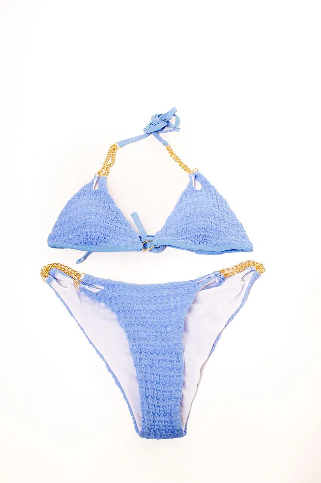Soft lavender textured bikini set featuring adjustable ties on top and bottom for a custom fit. Minimalist design with a delicate pattern.