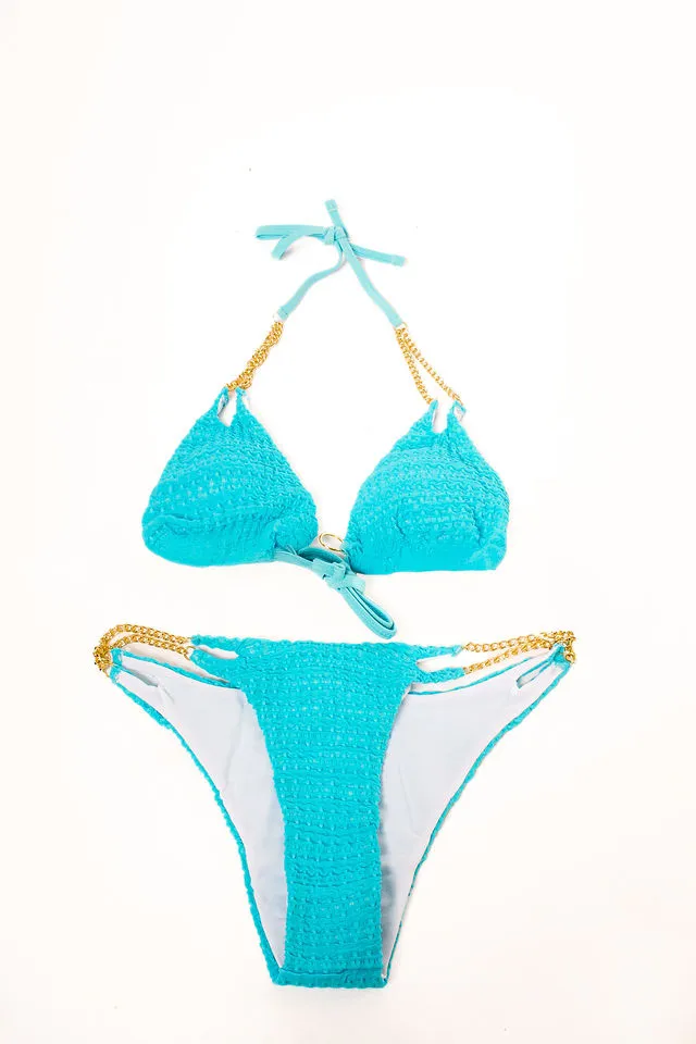 Soft mint green textured bikini with gold chain detailing. A subtle statement piece for refined summer looks.