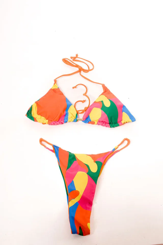 Bright multicolor abstract wave print bikini. Triangle top with matching cheeky bottoms. Made to stand out in the sun.