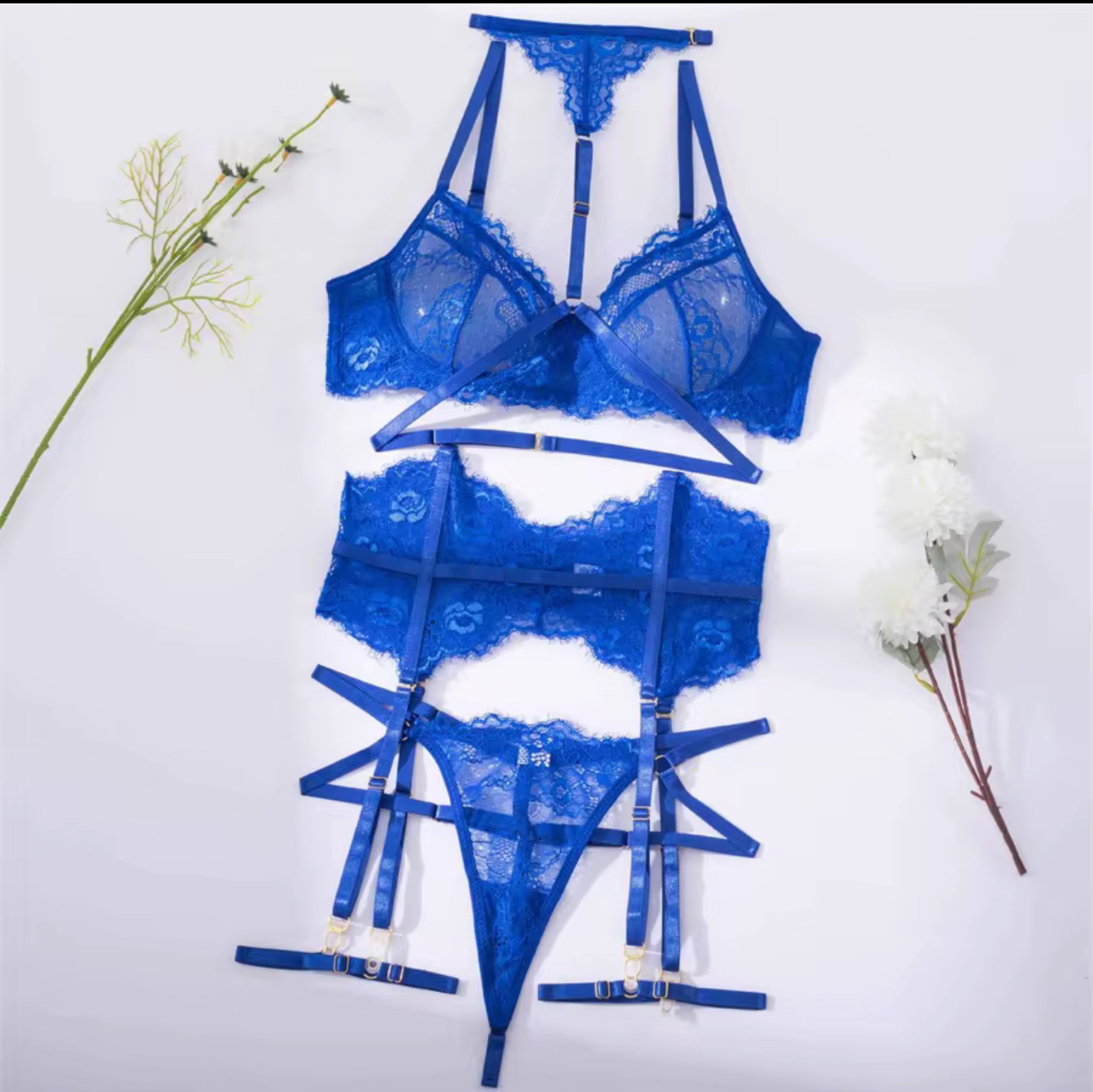 Deep royal blue lace with daring cut-outs and multiple garter straps. Comes with bra, thong, garter belt, and harness detail for a powerful, commanding look.